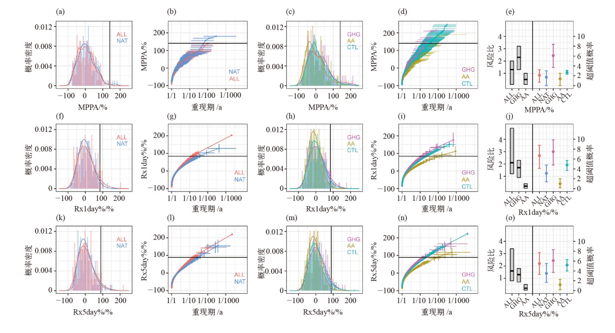 Fig. 6 Fitted distributions, return periods, risk ratios, and exceedance probabilities of domain-averaged MPPA (a-e) by the empirical probability formula and Rx1day% (f-j) and Rx5day% (k-o) by a GEV distribution in September 2021 over northern China based on ALL (red), NAT (blue), GHG (purple), AA (orange), and CTL (green) ensembles. Black lines indicate the observed threshold values of the September 2021 event, i.e., 140.5%, 83.87%, and 88.82% for MPPA, Rx1day%, and Rx5day%, respectively. Panels (e), (j), and (o) are best estimates and 90% confidence intervals of risk ratios (left, gray boxes) and exceedance probabilities (right, color bars). The error bars and boxes mark 5%-95% uncertainty ranges estimated via the bootstrapping method (N=1000)[82]