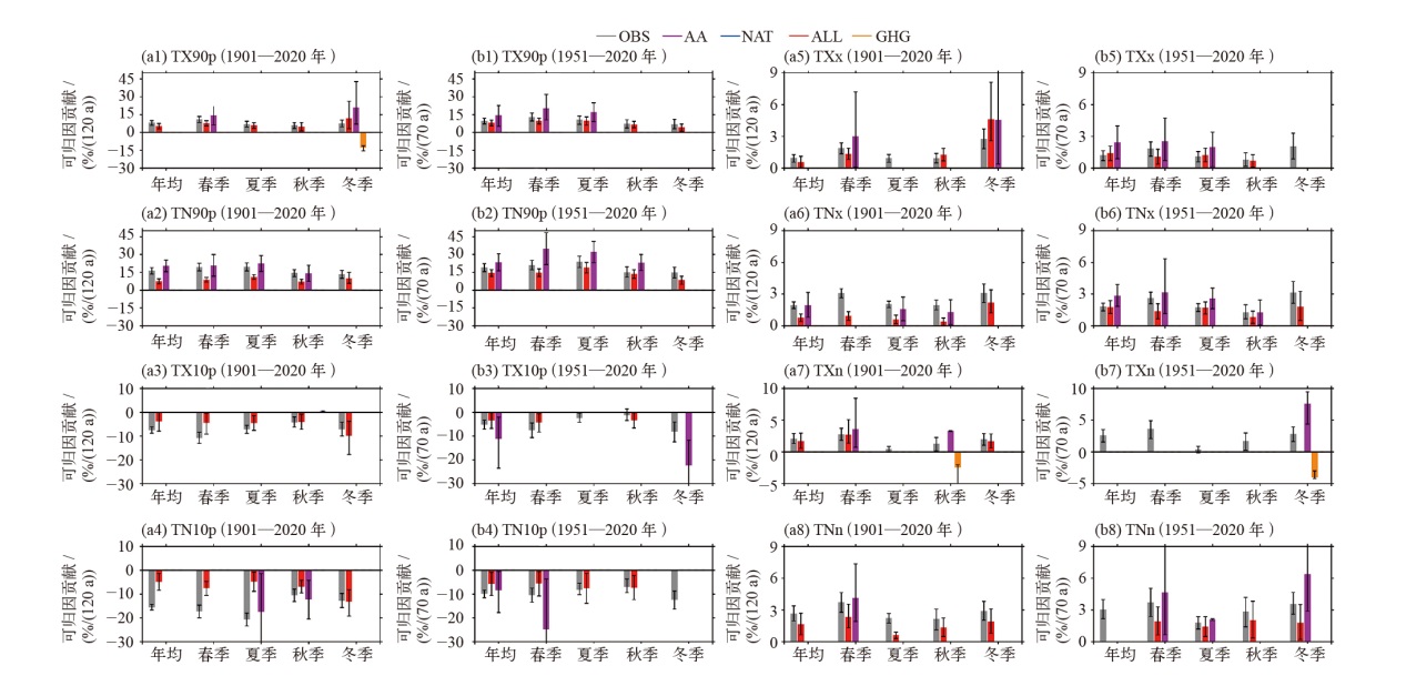 | Fig. 3 Detection and attribution of changes in extreme temperature indices based on centennial observations and CMIP6 model data in eastern China. (The figure shows attributable trends to ALL, GHG, AA, and NAT signals compared with the observed trends (OBS) for annual and seasonal indices during 1901-2020 (a) and 1951-2020 (b))[ |