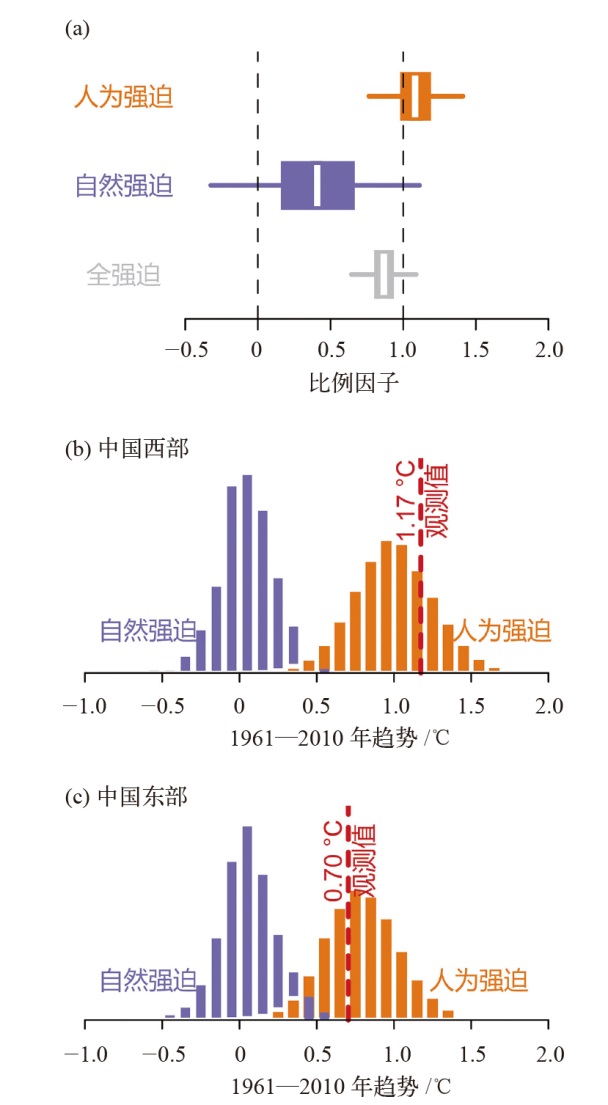 | Fig. 5 Climatic conditions that are increasingly conducive to summer heat stress as measured by summer mean wet bulb globe temperature (WGBT) in China have human-induced origins: estimates of scaling factors for one-signal (ALL) and two-signal (ANT and NAT) ?ngerprint analyses (a). The white lines mark the scaling-factor best estimates. The width of the boxplot represents the 25%-75% un-certainty ranges of the scaling-factor estimates, and the whiskers extend to the 5%-95% uncertainties ranges. Also shown are trend histograms of the observation-constrained 1961-2010 summer mean WBGT in a climate with anthropogenic-only forcings (orange) and with natural-only forcings (blue) for western (b) and eastern (c) China. The observed trends are marked by vertical red lines[ |