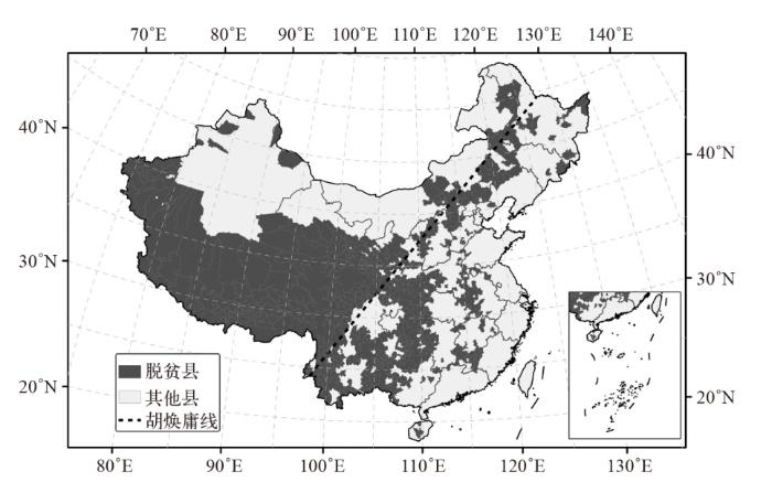 研究区域取自中国2001年《中国农村扶贫开发纲要(2001—2010年)》与2011年 《中国农村扶贫开发纲要(2011—2020年)》确定的位于全国25个省(市、自治区)共计832个重点县(已全部脱贫,下称脱贫县)(图1)。大部分脱贫县位于高原、山地和丘陵地区,西部地区脱贫县比例高于东部地区,例如西藏自治区74个县是脱贫县。西南地区脱贫县占比少于西北地区,但基本各省(市、自治区)脱贫县覆盖率仍达到30%以上。胡焕庸线于1935年由地理学家胡焕庸提出,揭示了中国东西部人口分布的巨大差异。胡焕庸线东部有530个脱贫县和1822个其他县,西部有302个脱贫县和224个其他县。