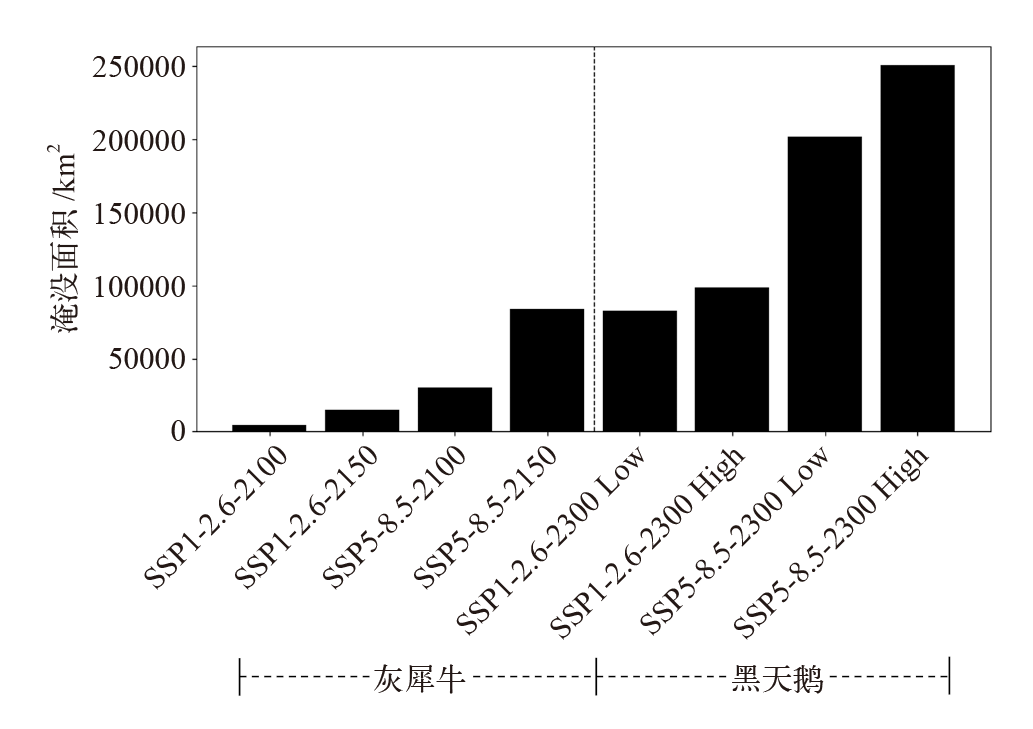 | 图2 冰盖快速消退极端情景下海平面上升淹没范围统计 |