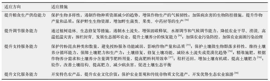 目前农业适应气候变化导致的生态后果研究较分散,多从农业种质资源保护、病虫害防控、土壤肥力保护和提升、农林复合系统减少气象灾害等方面开展[51-52],较少从生态系统服务的视角探究提升农业生态系统的供给、调节、支持和文化服务对提升农业气候韧性的重要性[53]。在提高农业生态系统供给服务方面,主要采取的气候变化适应措施体现在农业种植布局的调整以及适应性品种选育应用等(见表4)。农业生态系统恢复与治理,如水土保持工程、荒漠化治理和修复、土壤保护修复、农业污染防控、高标准农田建设等,能够恢复和提升农业生态系统调节服务,提高调节气候灾害的能力和支撑服务能力、增加农业生产系统的稳定性。在农业生态治理提升文化服务方面,采取的适应性措施包括开发绿色有机特色农产品、依托本地资源开发优势旅游产业以及将农业文化遗产保护同农民生计相结合,实现经济可持续发展。