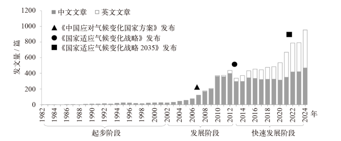注:在知网/Web of Science上分别以“气候变化/climate change”“适应/adaptation”和“农业/agriculture”为主题进行文献检索。检索时间限定为2024年12月以前发表的文献。其中,Web of Science限定研究区域为中国,在知网上共检索到相关文章6425篇,时间跨度为1982—2024年;在Web of Science上检索到英文论文2635篇,时间跨度为1995—2024年。
