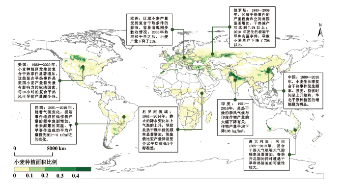 复合干热事件对自然环境系统和人类社会产生了深远影响。已有大量研究在多种时空尺度探究了复合干热事件的变化特征,包括空间范围、频率、持续时间和强度等方面。多数研究结果表明随着全球气候变化,大部分小麦主产区的复合干热事件显著增加,并预计随着全球变暖进一步加剧。