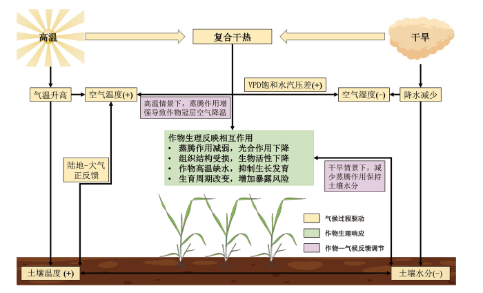 复合干热事件是由干旱和高温等极端气候因素同时或接连发生并相互作用、显著放大二者负面影响的复合极端事件,严重威胁农业生产,尤其是小麦等农作物的产量。尽管近年来有关研究日益增加,但对不同时空尺度的统一定义和表示方法尚未达成共识。