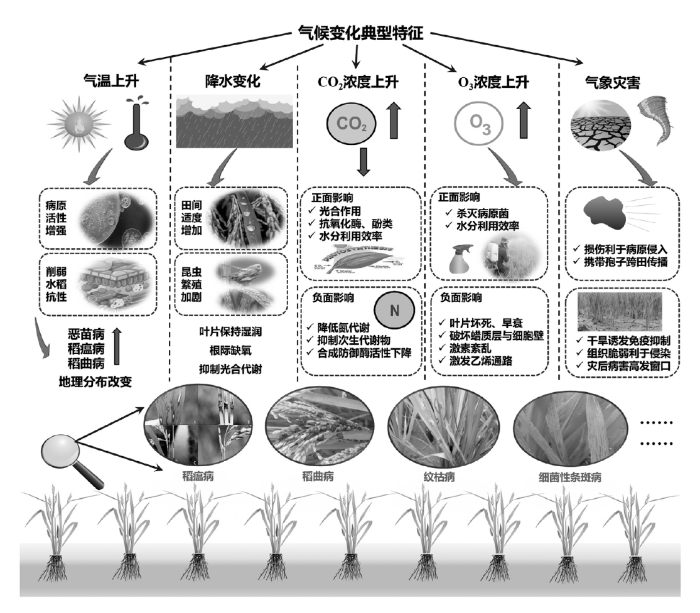 水稻生长环境湿润温暖,极易受到多种病原体的侵染。当前水稻病害种类繁多、分布广泛,主要危害叶片、茎秆、穗部和根系等关键部位,常在抽穗期、灌浆期等关键生育阶段集中暴发,对产量和品质构成严重威胁[29]。随着气候变化,病害种类和分布范围进一步扩大,部分热带病害正向高纬度地区蔓延[30]。其次,水稻病害的流行性和季节性受气候影响,高湿、高温环境为病害的暴发提供了理想条件,异常降水和极端天气事件则显著加剧了病害的传播风险[30-31]。同时,水稻病原体的传播途径呈多样化特征,包括气溶胶传播、水体介导扩散以及昆虫等媒介的间接传播[32-33]。本文将从气温上升、降水变化、CO2浓度上升、O3浓度上升和气象灾害5个方面系统梳理气候变化不同因子对水稻病害的影响机理(图2)。