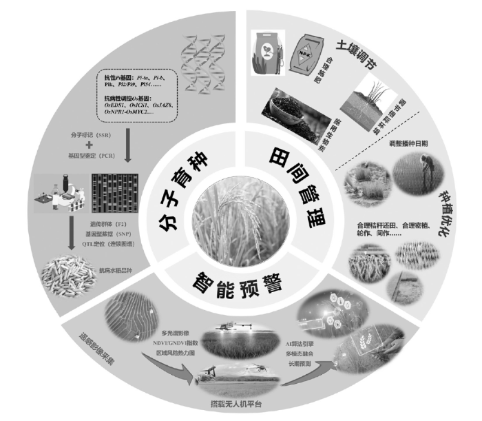 在防控策略层面,应构建以抗病品种选育、农艺措施优化和智能化管理为核心要素的协同应对体系。强化聚焦气候适应性和病害广谱抗性的水稻新品种培育,依托基因组选择、基因编辑等现代育种技术提升抗性遗传基础与稳定性;并结合不同气候风险区特征,优化栽培管理措施,如调整播期、合理密植、控水控氮等,从生态系统层面增强田间群体的综合抗逆能力。