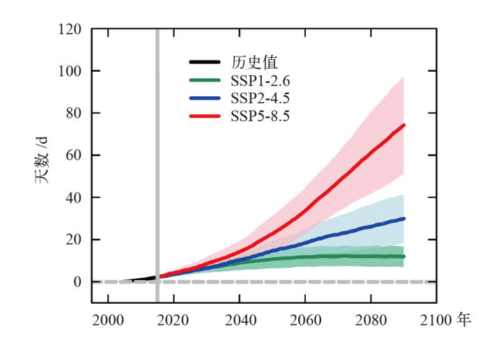 | 图5 SSP1-2.6、SSP2-4.5和SSP5-8.5情景下亚洲中高纬区区域平均的HWD变化(相对于1995—2014年,下同) 注:时间序列进行20 a滑动平均,阴影表示模式间±标准差范围。 |