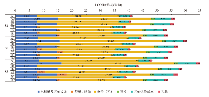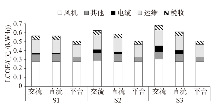 图2为各情景下不同方案海上风电的成本构成。各制氢方案中,海上风电场的风机占比最大,运维及税收成本差异较小。平台制氢技术未涉及海上风电传输,因此无电缆成本。在S1情景下,由于离岸距离较短,两种电缆的成本差值尚未抵消直流输电与交流输电的初始投资成本的差值,因此交流输电时的风电成本略小于直流输电。在S2和S3情景下,交流输电时的风电成本均大于直流输电,主要原因是交流电缆的成本高、电力损耗大。