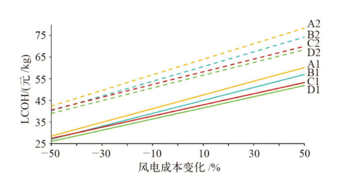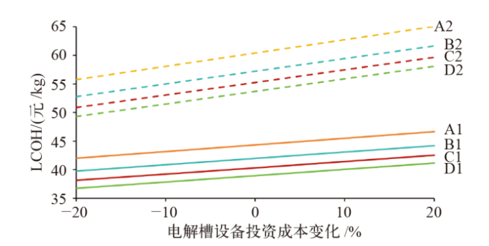 不同方案LCOH随电解槽设备投资成本的变化图