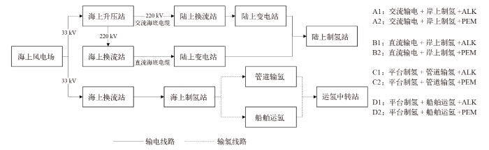 为探讨电解槽类型对海上风电制氢技术选择的影响,将上述4种海上风电制氢技术与ALK、PEM两种主流电解技术进行组合,从而形成8种典型的海上风电制氢方案(图1)。