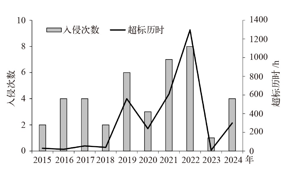 | 图9 2015—2024年钱塘江(南星水厂)咸潮入侵次数及持续时间变化 |