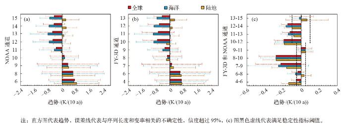为便于对比,将FY-3D逐日轨道亮温转化为与NOAA时空分辨率匹配的月均网格气温。首先,选取FY-3D星下点亮温(即扫描线中央两点平均)以避免扫描角误差,然后按NOAA网格区域将轨道资料进行空间平均,再进行日和月时间平均,得到2019年1月至2024年12月逐月平均全球网格气温资料(简称FY-3D)。选取与NOAA中心频率相同的9个通道气温开展对比(FY-3D 在2021年11月缺测,NOAA 通道9/11/12/13/14/15在2024年8—12月缺测)。通过面积加权将网格气温转化为全球、海洋和陆地等区域月平均气温和距平(气候基准态取2019—2023年平均,月值和气候态的差值即为距平)。参考GCOS气候基本变量观测需求稳定性评估指标[18,22],通过FY-3D与NOAA距平差值趋势的绝对值评估FY-3D气温稳定性,绝对值越小代表观测稳定性越高,越大代表观测越不稳定(后文省略绝对值)。稳定性阈值随通道高度变化,其中对流中上层通道4/6/7和平流层下层通道8/9稳定性阈值为0.05 K/(10 a),平流层中上层通道10~13稳定性阈值为0.10 K/(10 a)(表1)。