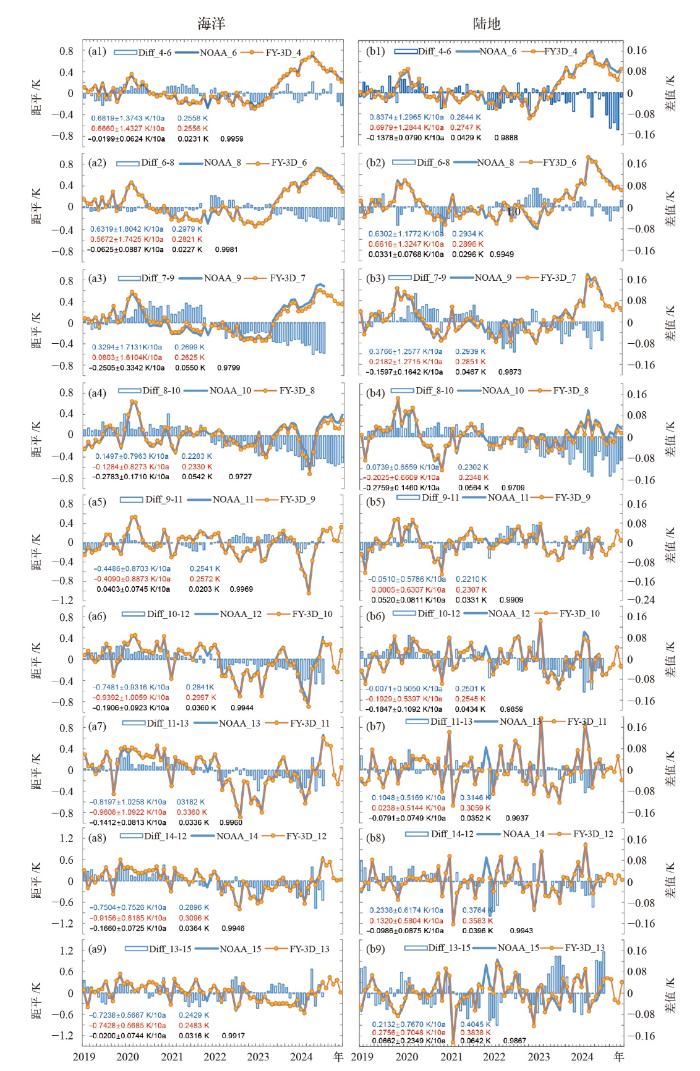 2019—2024年FY-3D和NOAA 9个通道月平均全球海洋(a)和陆地(b)气温距平和差值序列