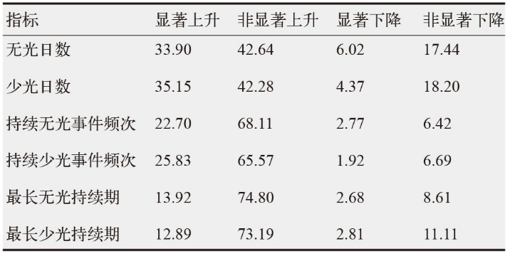 表2 1981—2020年中国太阳能干旱事件6个指标变化趋势显著性检验结果的站点占比