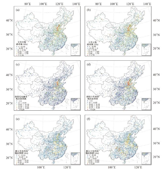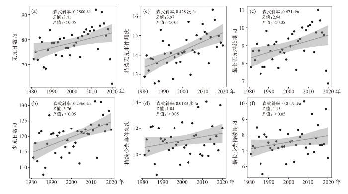 分析中国1981—2020年太阳能干旱事件6个指标的年际变化,结果表明各指标在时间尺度上呈现出显著差异性变化(图1)。其中持续少光事件频次和最长少光持续期分别以0.0183次/a和0.0119 d/a的速率呈现微弱的上升趋势,但均未通过0.05的显著性水平检验。而持续无光事件频次、少光日数、最长无光持续期和无光日数均表现出显著上升趋势(p<0.05),上升速率分别为0.428次/a、0.2366 d/a、0.471 d/a和0.2800 d/a。总体来说,太阳能干旱事件6个指标在1981—2020年间呈现出不同程度的上升趋势,表明中国太阳能干旱事件总体呈增加趋势,这与任国玉等[18]关于全国日照时数下降的结论一致。