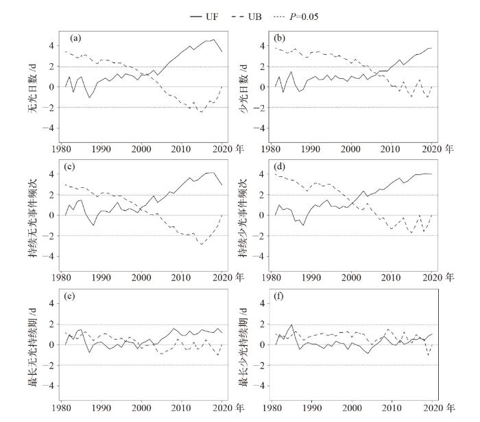 6个指标的MK突变结果(图2)表明,不同指标的趋势转折特征存在显著差异。无光日数、少光日数、持续无光事件频次、持续少光事件频次均在2000年前后出现明显突变,突变后UF序列持续上升并通过0.05的显著性检验,表明太阳能干旱事件频次与持续天数呈显著增加趋势。而最长无光持续期、最长少光持续期的UF与UB序列在1981、1982年等年份多次相交,但均未通过0.05的显著性检验,表明两者未发生突变现象。此外,进一步分析6个指标极值年份可知,在1981、1982、1996、1999、2001、2006和2010年等突变节点对应太阳能干旱事件的极高值或极低值,可视为太阳能干旱事件的典型年份。