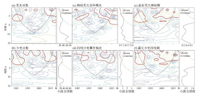 为探究1981—2020年全国太阳能干旱事件的周期规律,对其Morlet小波及其功率谱进行分析,结果如图4所示,其中左侧为小波功率谱,轮廓越密集代表小波功率越大;红线表示太阳能干旱事件的各指标周期;右侧为全局小波谱和显著性检验,虚线小于小波功率谱曲线时,对应周期在0.05水平下具有显著性。结果表明,全国太阳能干旱事件指数周期存在明显差异,各周期强度功率谱不同。无光日数的小波功率谱主要存在1~4 a和4~6 a周期,其年份主要对应1982—1992年和2010—2020年,且右侧小波全谱显示这些周期通过了0.05的显著性检验。少光日数的小波功率谱周期变化与无光日数相似,存在1~6 a和1~2 a周期,前者对应1981—1993年和2008—2019年,后者对应1992—2005年。持续无光事件频次和持续少光事件频次的小波功率谱均显示出较强的小周期特征,集中在2~6 a,且在1981—1995年和2000—2020年间表现出较高的功率和显著性。最长无光持续期和最长少光持续期的小波功率谱主要存在2~6 a和1~5 a周期,分别对应1981—1990年和1995—2020年,且均通过了显著性检验。