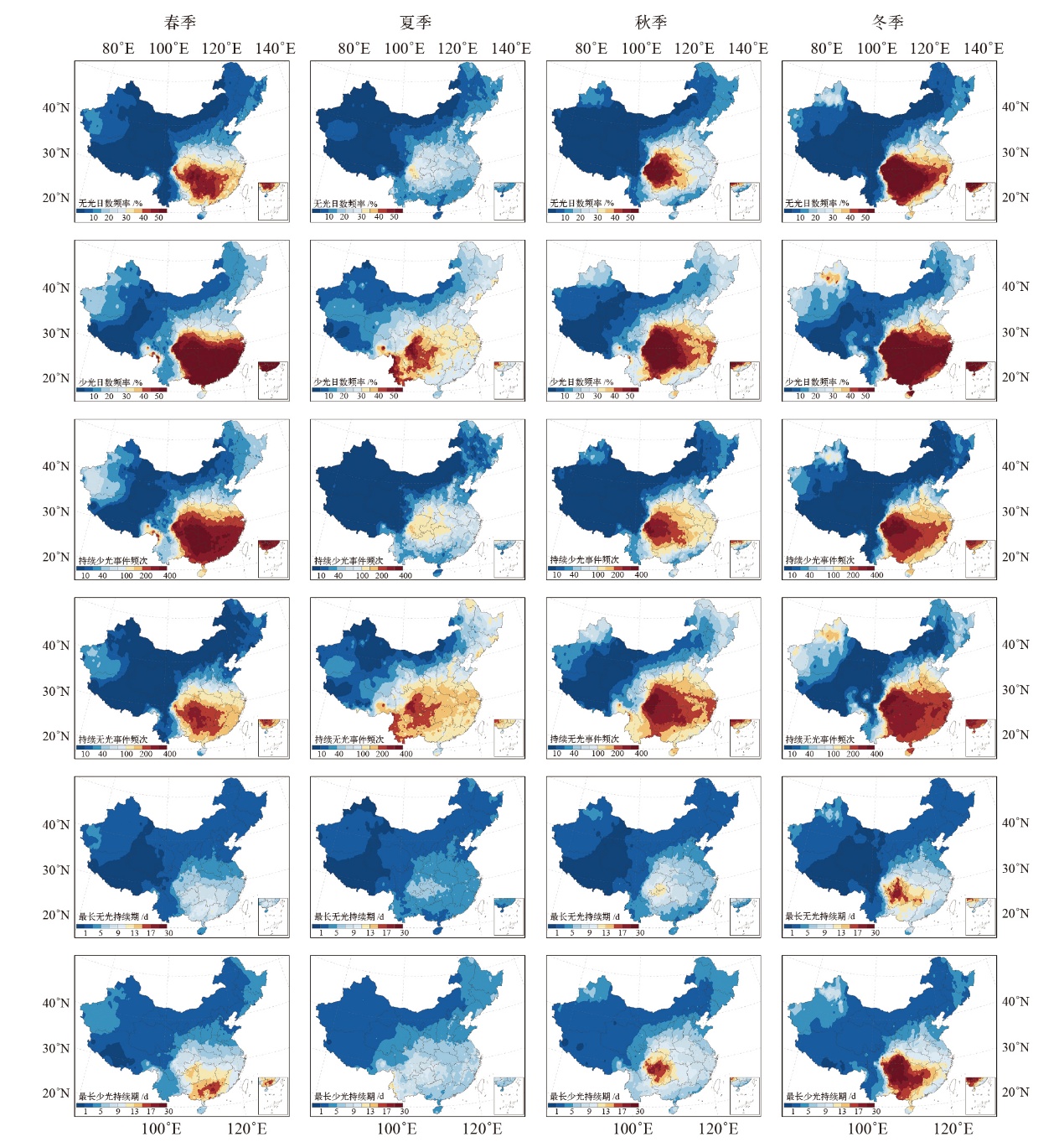 | Fig. 3 Distribution of solar drought event indicators in China for each season from 1981 to 2020 |