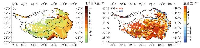 2022年青藏高原7—8月日最高气温(a)及其与植被生长最适温度的差值(b)的空间分布