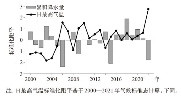2000—2022年青藏高原生长季平均日最高气温和累积降水量的标准化距平