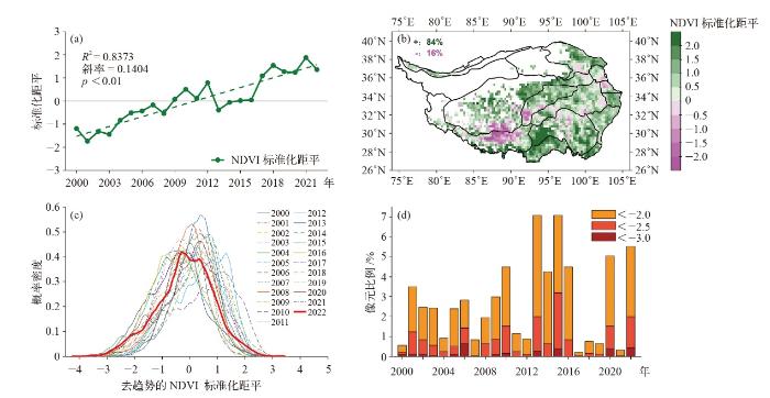 青藏高原植被生长状况(a) 2000—2022年青藏高原区域生长季平均NDVI的标准化距平,(b) 2022年生长季平均NDVI标准化距平值的空间分布,(c) 2000—2022年去趋势后的生长季平均NDVI标准化距平的概率密度函数,(d) 2000—2022年去趋势后的生长季平均NDVI标准化距平低于-2.0、-2.5和-3.0的像元占比
