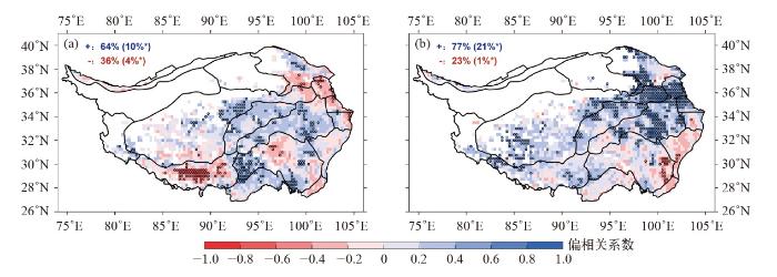 2000—2022年去趋势的青藏高原地区生长季平均NDVI与平均日最高气温(a)和累积降水量(b)的偏相关系数的空间分布