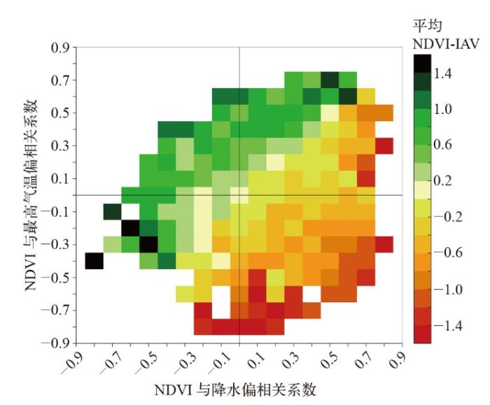 偏相关分析为在剔除协变量的影响下,探究某两个变量之间相关性的一种分析方法,能够有效反映两个变量之间的直接相关性[41]。对2000—2022年去趋势的生长季累积降水量、生长季平均日最高气温与去趋势的生长季NDVI进行偏相关分析,这里长期趋势采用Theil-Sen方法得到。