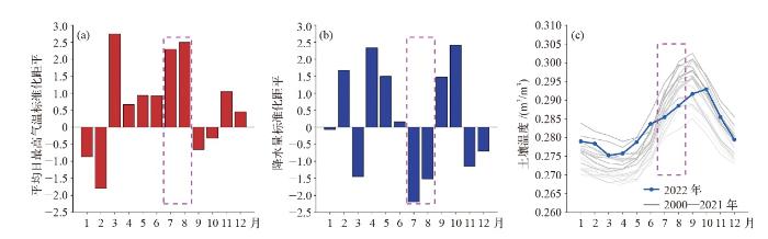 2022年青藏高原研究区域日最高气温(a)、累积降水(b)和0~289 cm深度平均土壤湿度(c)的逐月变化情况