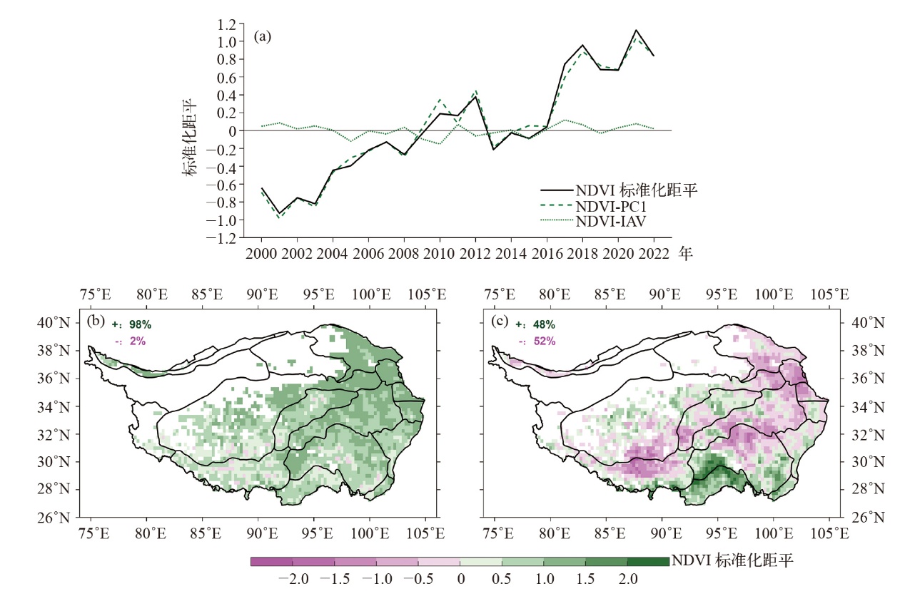 | Fig. 4 Principal component analysis results of NDVI standardization anomaly during the growing season in the Tibetan Plateau. (a) Time series of regional average standardized anomaly of NDVI, NDVI-PC1 reconstructed by the first principal component, and NDVI-IAV reconstructed by the 2nd to 6th principal components over the Tibetan Plateau from 2000 to 2022, (b) spatial distribution of NDVI-PC1 in 2022, (c) spatial distribution of NDVI-IAV in 2022 |