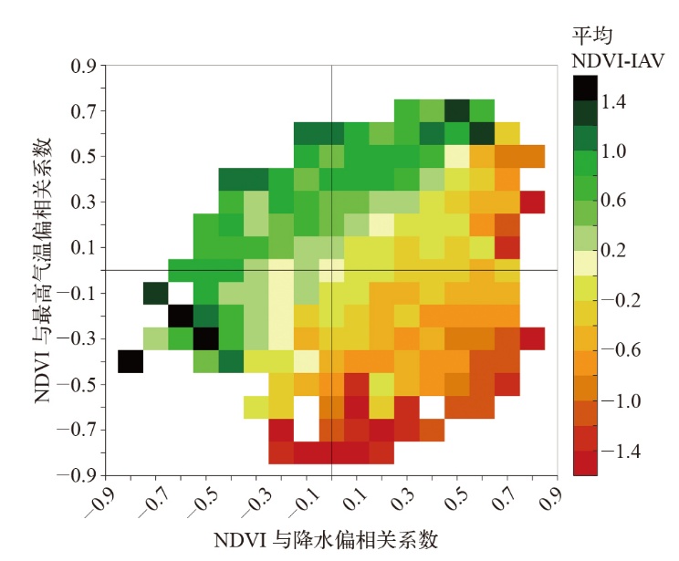 | 图7 2022年复合高温干旱事件造成青藏高原植被变化的空间分布特征 注:填色像元代表对应相关系数下2022年青藏高原地区经PCA处理得到的NDVI-IAV的平均值。 |