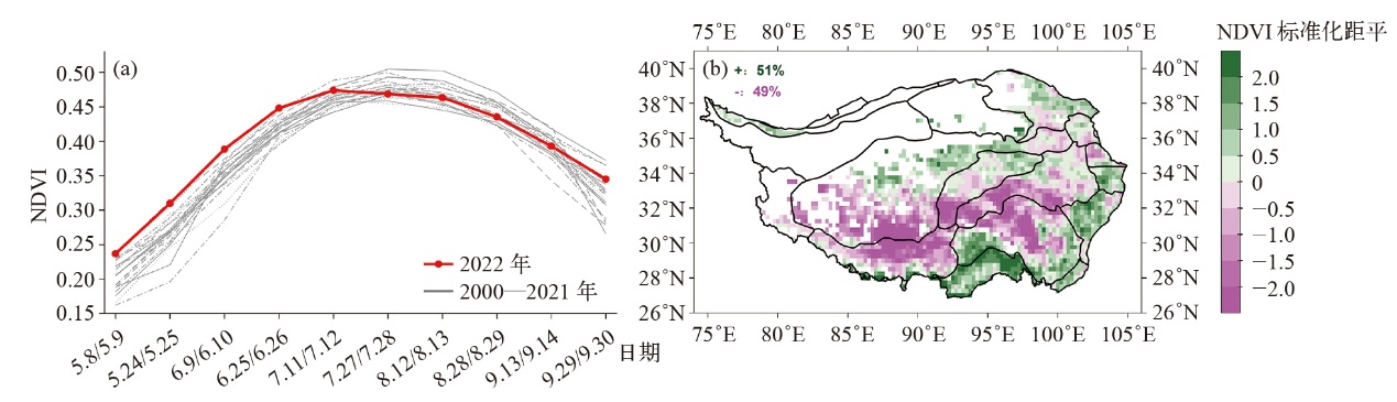 | Fig. 8 Changes in NDVI during the growing season in the Tibetan Plateau. (a) Interannual variability of regionally averaged NDVI, (b) spatial distribution of standardized anomaly of NDVI in July-August, 2022 |