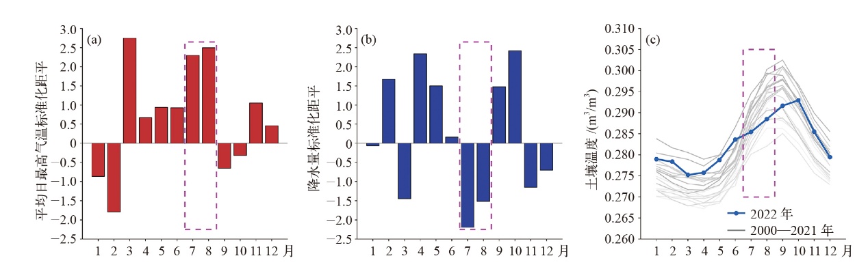 | Fig. 9 Monthly variations of daily maximum temperature (a), cumulative precipitation (b), and soil moisture averaged over 0-289 cm depth (c) on the Tibetan Plateau in 2022 |