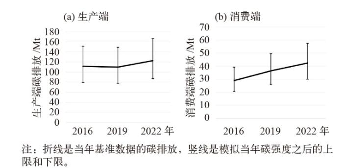 本研究基于蒙特卡罗模拟的碳排放矩阵,核算了不确定性信息扰动下的2016、2019、2022年全球可再生能源系统的碳排放量。图9为蒙特卡罗模拟后各生产端和消费端碳足迹的上下波动情况。2016年和2019年,生产端碳排放量与基准情况相比,在±40 Mt范围内波动,而消费端碳排放则在-8.5~+13.5 Mt之间波动。2022年,生产端碳排放的区间为[86.86,166.68] Mt,消费端碳排放的区间为[29.96,57.44] Mt。消费端碳排放量维持在比生产端低65%~75%的水平。