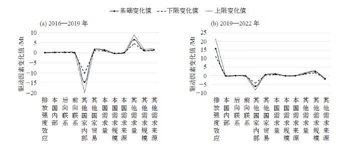 图11为蒙特卡罗模拟后各驱动因素的上下波动情况。如图11(a)所示,基于蒙特卡罗模拟后的碳排放驱动因素分析显示,2016年至2019年间,中国国内生产结构对全球可再生能源碳排放的贡献为正向影响[0.19,0.37] Mt,表明国内生产活动在一定程度上增加了碳排放。前向联系增排范围为[0.07,0.13] Mt,后向联系的影响范围更为显著,为[0.22,0.43] Mt。如图11(b),2019年至2022年间,国内生产结构的影响转为减排,范围在[-0.04,-0.07] Mt之间,后向联系的变化范围降为[0.05,0.09] Mt,前向联系逆转至微弱负值区间[-0.07,-0.14] Mt,表明下游需求对碳排放的拉动作用减弱,出现微弱的减排效应。2016—2019年以及2019—2022年两个时间段内,本国需求量效应始终起到正向促进作用,贡献范围由[0.93,1.78] Mt变为[0.68,1.30] Mt,而本国需求规模始终起到减排作用,贡献范围由[-0.17,-0.32] Mt变为[-0.03,-0.05] Mt。