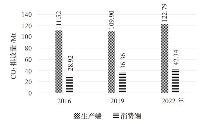 2016、2019和2022年全球可再生能源发电部门在生产端和消费端的碳排放情况