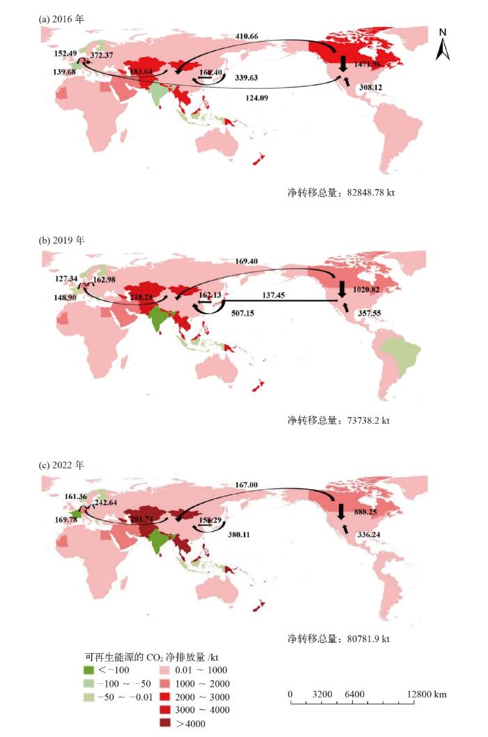全球可再生能源发电部门隐含CO2 2016、2019、2022年转移特征