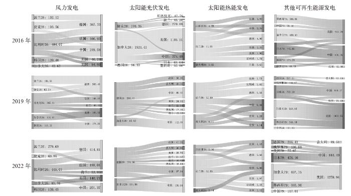 图3展示了风能、太阳能光伏、太阳能热能及其他可再生能源发电部门的前十大隐含CO2转移路径。2016年至2022年,太阳能光伏发电部门的前十大转移路径的隐含CO2排放量减少了79.99%。其中,加拿大太阳能光伏发电部门的对外传输路径降低最多,这主要因为该部门碳排放强度降低了20.71%。德国不仅是其他国家风电部门的重要接收国,也是太阳能光伏和其他可再生能源发电部门的重要出口国,这再次证明了德国不仅具有强大的可再生能源生产力,而且消费能力突出。而作为可再生能源发电部门碳排放主要接收国的中国和美国,通过国际贸易联系将部分碳排放负担转移到了其他地区。这反映了两国在追求经济发展的同时,也面临碳排放监管与治理的任务,需要更加重视并加强可再生能源发展。