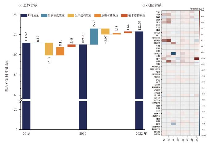 注:(b)图横坐标Δf为碳排放强度效应,ΔL为生产结构效应,ΔY为总需求量效应,ΔV为需求规模效应;数字1代表2016—2019年,数字2代表2019—2022年。例如,Δf1指2016—2019年的碳排放强度效应,Δf2指2019—2022年的碳排放强度效应。