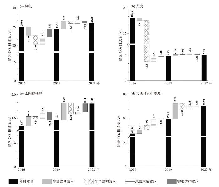 从2016年到2019年,碳排放强度效应促使风电和太阳能光伏发电部门分别实现了2.30 Mt和0.51 Mt减排,但导致太阳能热能发电和其他可再生能源发电部门增加了0.16 Mt和2.77 Mt排放量。这表明在此期间,风电和太阳能光伏发电技术在碳减排方面的显著成效。相比之下,2019年至2022年,碳排放强度效应导致所有部门的排放量均有所增长,且相较于前一阶段表现出成倍增加的趋势。这也表明可再生能源技术在发展和应用上存在一定的局限性,导致部分可再生能源不能实现理想的减排效果。