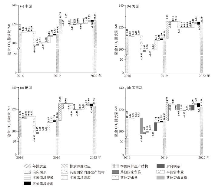 在生产结构效应的分析中,如图6所示,2016年至2022年间,中国、美国、德国和墨西哥的国家内部生产结构均由增排转为减排效应,可以看出各国积极推动国内生产体系低碳转型。而4个国家的后向联系持续促进了隐含CO2排放的增加。其中,美国的后向联系促进效应增强,从2016年到2019年,排放量增加0.02 Mt,而到了2019年至2022年期间,增量上升至0.07 Mt。而德国该效应增量稳定在0.15 Mt左右。这一现象表明各国在进行商品贸易时,进口过程中可再生能源电力相关产品数量呈现增长趋势,不仅有助于贸易参与国实现减排,也将会对全球低碳减排目标产生不可忽视的影响。从前向联系效应来看,中国、美国和墨西哥三国的前向联系由加剧排放转为促进减排,这一积极转变显示出,这些国家在产业链下游环节低碳技术和清洁能源的应用与推广中取得了进步。反之德国前向关联效应增长70%,由0.10 Mt扩大为0.17 Mt。这说明德国出口中间产品对可再生能源部门的碳增排具有较大影响,因此需要提高和改进其在中间产品生产中的能源转换和使用效率,以减少对全球碳减排目标的潜在负面影响。