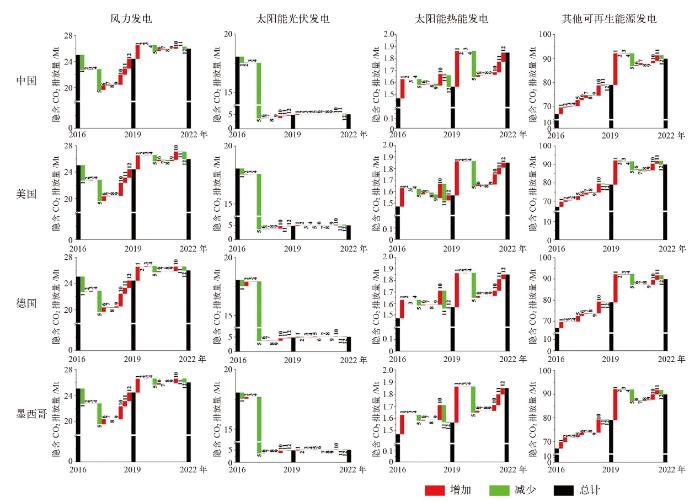 就太阳能光伏发电部门而言,德国与墨西哥的国内生产结构效应经历了由加剧碳排放到减少碳排放的转变。相比之下,在太阳能热能发电领域,美国的后向联系则从原先的减排效果转变为微弱的增排趋势。在其他可再生能源部门中,这4个国家的内部生产结构表现出了与整体可再生能源部门相似的效应,同时后向联系也普遍呈现出增加可再生能源碳排放的现象,这反映出这些国家上游地区对可再生能源电力的利用呈现增长趋势。值得注意的是,中国、美国和墨西哥在其他可再生能源电力部门中的前向联系效应,已经由原先的增排转变为减排的趋势,可能在于这3个国家在与下游市场的交流中,重视绿色电力的推广以及节能技术的应用,同时技术水平不断进步,生产效率显著提升,资源利用率得以提高。