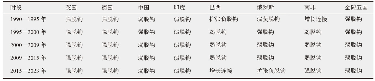采用Tapio指数模型对各国甲烷排放与GDP脱钩情况进行分析,以1990年为研究起点,避免俄罗斯因苏联解体造成的统计范围明显变动,并考虑将《京都议定书》(1995年)、《哥本哈根协议》(2009年)、《巴黎协定》(2015年)等重要文件达成时间作为关键研究节点。在开展金砖五国脱钩分析前,对部分发达国家进行甲烷排放与经济增长脱钩关系测算,发现英国和德国甲烷排放与经济增长长期处于脱钩状态,反映出Tapio指数模型的应用存在一定合理性。金砖五国脱钩结果(表2)表明,金砖五国整体甲烷排放与经济增长的关系由强脱钩过渡到弱脱钩状态,即进入21世纪以来甲烷排放与经济同步增长,但经济增速更快。中国在1995—2000年间出现短暂的强脱钩状态,其余时段均为弱脱钩状态;印度始终处于弱脱钩状态;巴西近年来甲烷排放与经济增长关系密切,主要是因为畜牧业等甲烷主要排放源的快速发展;俄罗斯甲烷排放与经济增长的关系变化较大,现阶段甲烷排放和经济增速呈现扩张负脱钩状态,即甲烷排放与经济增速同步增长,但甲烷排放增速更快;南非的脱钩状态逐渐转为强脱钩,意味着南非的经济社会发展正逐步摆脱甲烷治理问题。总体来看,巴西和俄罗斯是金砖五国中甲烷脱钩状态演化最慢的,经济发展方式对甲烷排放仍有一定促进作用。中国、印度呈现相似的演进态势,长期保持着弱脱钩状态,南非则是金砖五国中率先实现了经济发展与甲烷排放脱钩的国家。