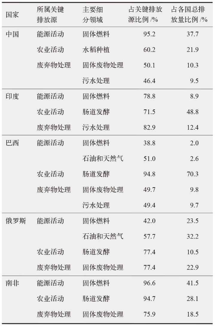 结合更进一步的关键排放源分析(表3)来看,固体燃料即煤炭开采活动甲烷排放对中国甲烷排放贡献最大,占比37.7%;与其他成员国不同,我国作为世界上最大的水稻生产国,水稻种植是农业活动甲烷排放的主要来源,占比超60%;固废和污水处理的甲烷排放在废弃物处理领域贡献相当。印度能源活动甲烷排放的主要来源也是煤炭开采,占比近80%;由于畜牧业发达,动物肠道发酵是印度农业活动甲烷排放的最大来源,占比超70%,占全国总甲烷排放的一半;污水处理是印度废弃物处理领域甲烷排放的主要来源,占比82.9%。巴西的能源消费以水电为主,能源活动甲烷排放量小,占比也小;与印度类似,发达的畜牧业使得动物肠道发酵成为甲烷排放的重要来源,占全国总排放的70%以上;固废和污水处理产生的甲烷排放贡献相当,在全国总排放中的占比均约为10%。俄罗斯是石油和天然气生产大国,石油和天然气产生的甲烷排放占全国总排放的32.2%,其次为煤炭开采甲烷排放;动物肠道发酵和固废处理分别是俄罗斯农业活动和废弃物处理领域甲烷排放的主要来源,分别占全国总排放的10.5%和22.9%,俄罗斯固废处理甲烷排放占比水平显著高于其他成员国。南非的甲烷排放结构与中国高度类似,主要来自固体燃料、肠道发酵和固体废物处理,分别占全国甲烷总排放的41.5%、28.1%和18.5%。