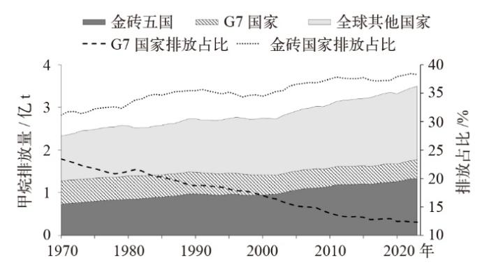 根据EDGAR公布的全球最新甲烷排放数据(图1),全球人为甲烷排放整体呈上升趋势,从1970年的2.33亿t升至2023年的3.49亿t,2014—2023年年均增速达1.0%。受疫情等因素影响,2020年全球甲烷排放量出现小幅下降。其中,G7国家甲烷排放量呈缓慢下降趋势,自1970年的0.55亿t下降至2023年的0.43亿t;而金砖五国甲烷排放量上升趋势明显,自1970年的0.72亿t上升至2023年的1.34亿t,2014—2023年年均增速1.2%,超过全球平均水平0.2个百分点。从排放占比来看,G7国家甲烷排放占比从1970年的23.4%下降至2023年的12.3%,金砖五国排放占比自1970年的31.1%上升至2023年的38.3%。