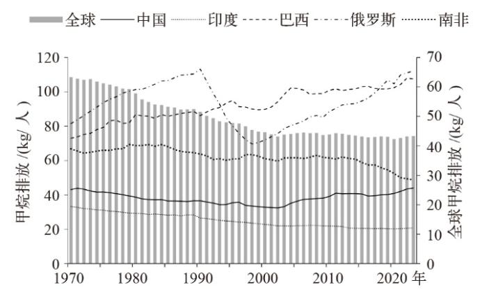 1970—2023年金砖五国人均甲烷排放量