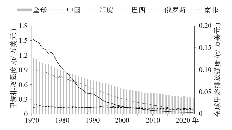 | 图4 1970—2023年金砖五国甲烷排放强度 |