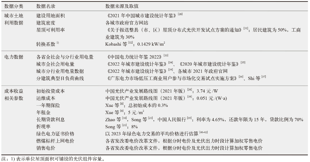 城市屋顶光伏系统模型、经济性分析相关参数来源和取值如表1所示。
