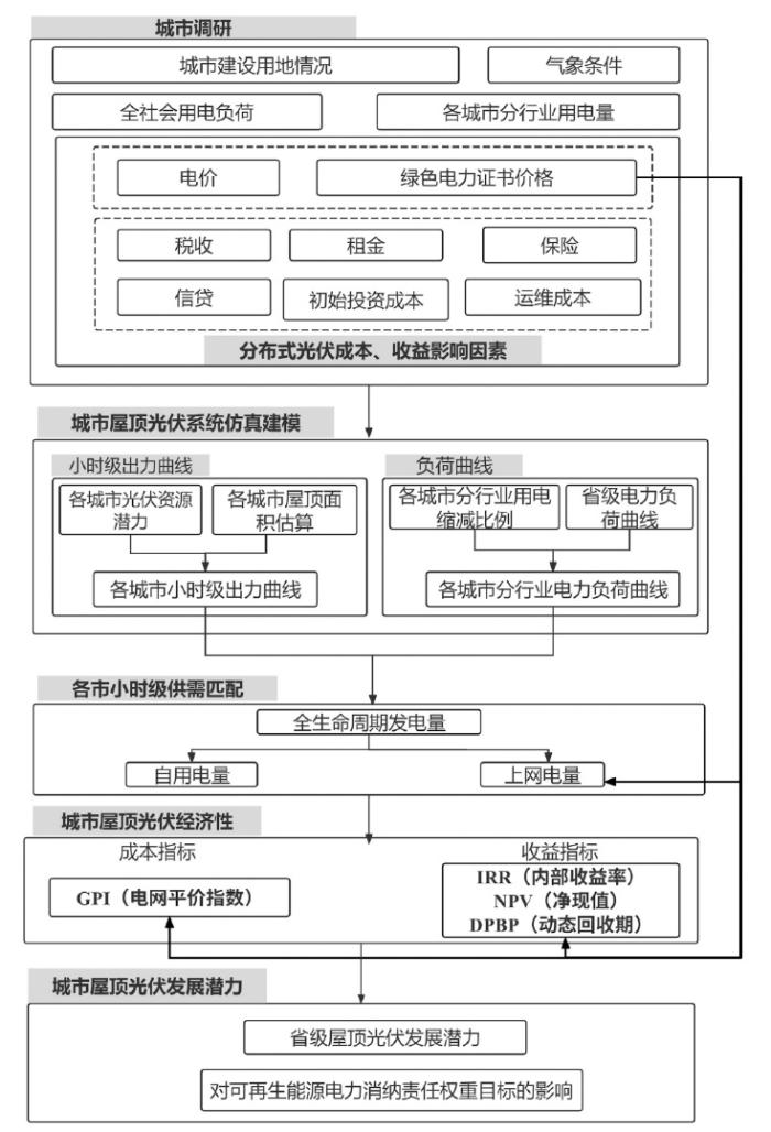 本文的分析步骤如图1所示:首先,调研各城市的气象条件、建设用地、用电负荷等基础信息并对缺失数据进行处理;其次,对各城市居民建筑和工商业建筑屋顶光伏系统进行仿真建模,刻画小时级的光伏发电出力与用电负荷特性;接着,通过逐时匹配光伏发电与用电需求,分析更贴近实际的自用电量和上网电量;然后,综合成本和收益指标进行经济性测算,重点分析绿证通过提高上网电量收入对屋顶光伏经济性的改善作用,以及不同城市间的异质性影响;最后,评估本地消纳的绿证电量纳入节能考核对地方可再生能源消纳目标的潜在贡献。
