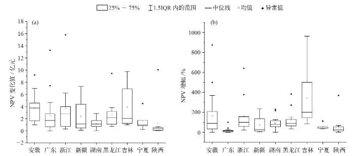 在实施绿证后,各城市NPV显著增长(图4)。居民建筑的平均NPV达到6.99亿元,平均增长2.15亿元,增幅为44.42%。其中,东北地区的NPV增加尤为显著,黑龙江和吉林各城市的NPV分别平均增加2.66亿元和3.88亿元。尽管发达地区(如广东、浙江等)的IRR增幅相对较小,但由于这些地区在绿证实施前已经具备较高的初始经济水平和较大的装机潜力,绿证的引入仍推动了NPV绝对规模的大幅增长。例如,浙江各城市的NPV平均增加3.69亿元,充分体现了规模效应的作用。相比之下,中部地区的NPV增幅相对较低。